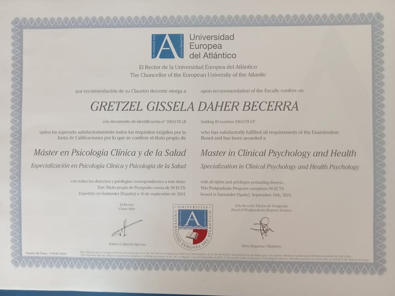 Mi curiosidad y vocación me llevaron a profundizar mis conocimientos con una Maestría en Psicología Clínica y de la Salud en la Universidad Europea del Atlántico, donde me especialicé en Psicología clínica y de la salud. Con cada curso, cada taller y cada práctica, fui fortaleciendo mi capacidad de comprender y acompañar a las personas en todas las etapas de la vida, desde niños y adolescentes hasta adultos mayores.